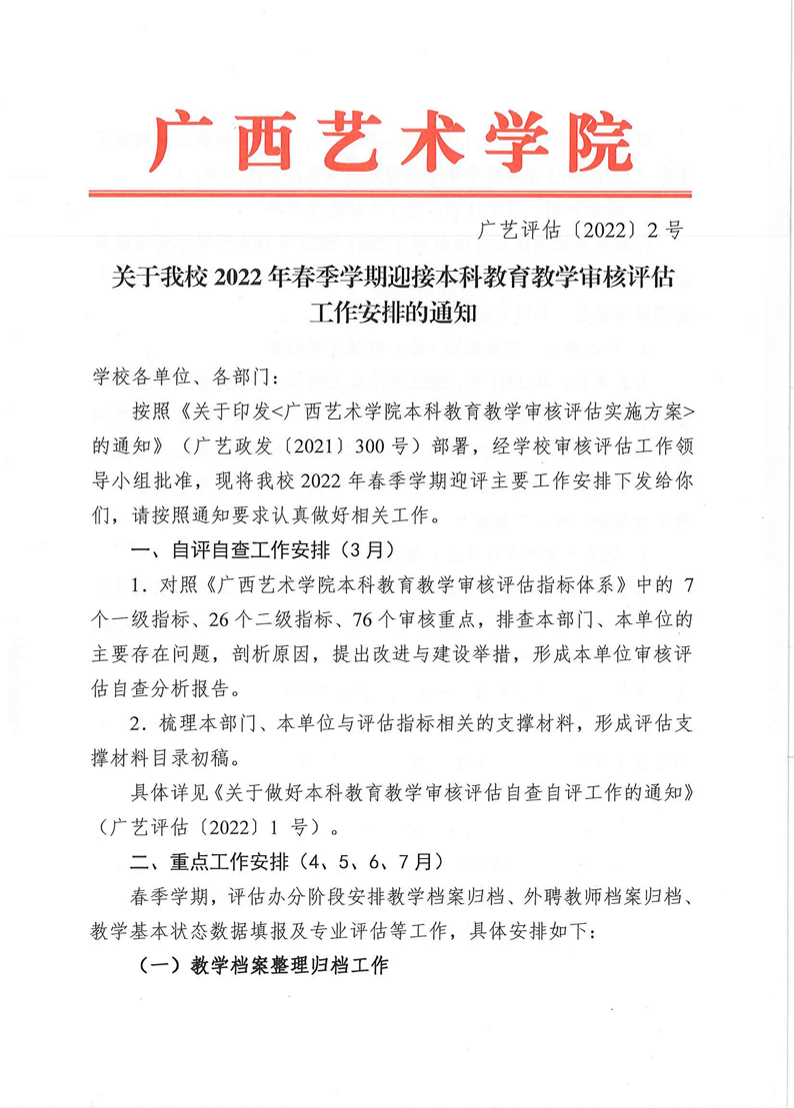 广艺评估〔2022〕2号关于我校2022年春季学期迎接本科教育教学审核评估工作安排的通知 来源: 发布时间:2022-03-14 23:12:03 浏览次数: 次 【字体:小 大】 分享到: 【打印正文】