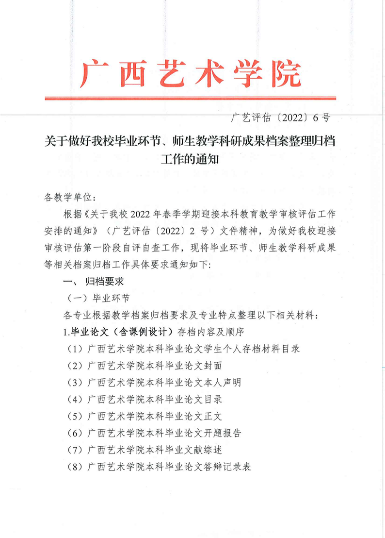 广艺评估〔2022〕6号 关于做好我校毕业环节、师生教学科研成果档案整理归档工作的通知 来源: 发布时间:2022-04-01 09:13:34 浏览次数: 次 【字体:小 大】 分享到: 【打印正文】