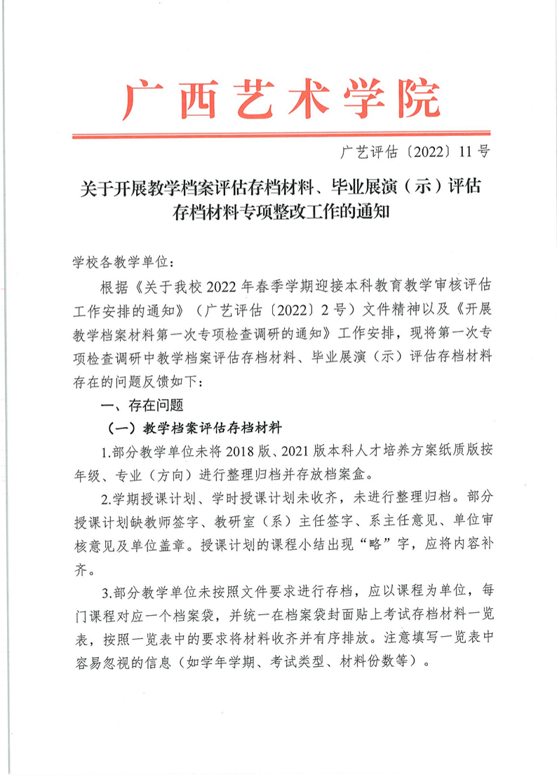 广艺评估〔2022〕 11号 关于开展教学档案评估存档材料、毕业展演(示)评估存档材料存档材料专项整改工作的通知 来源: 发布时间:2022-10-19 11:16:06 浏览次数: 次 【字体:小 大】 分享到: 【打印正文】