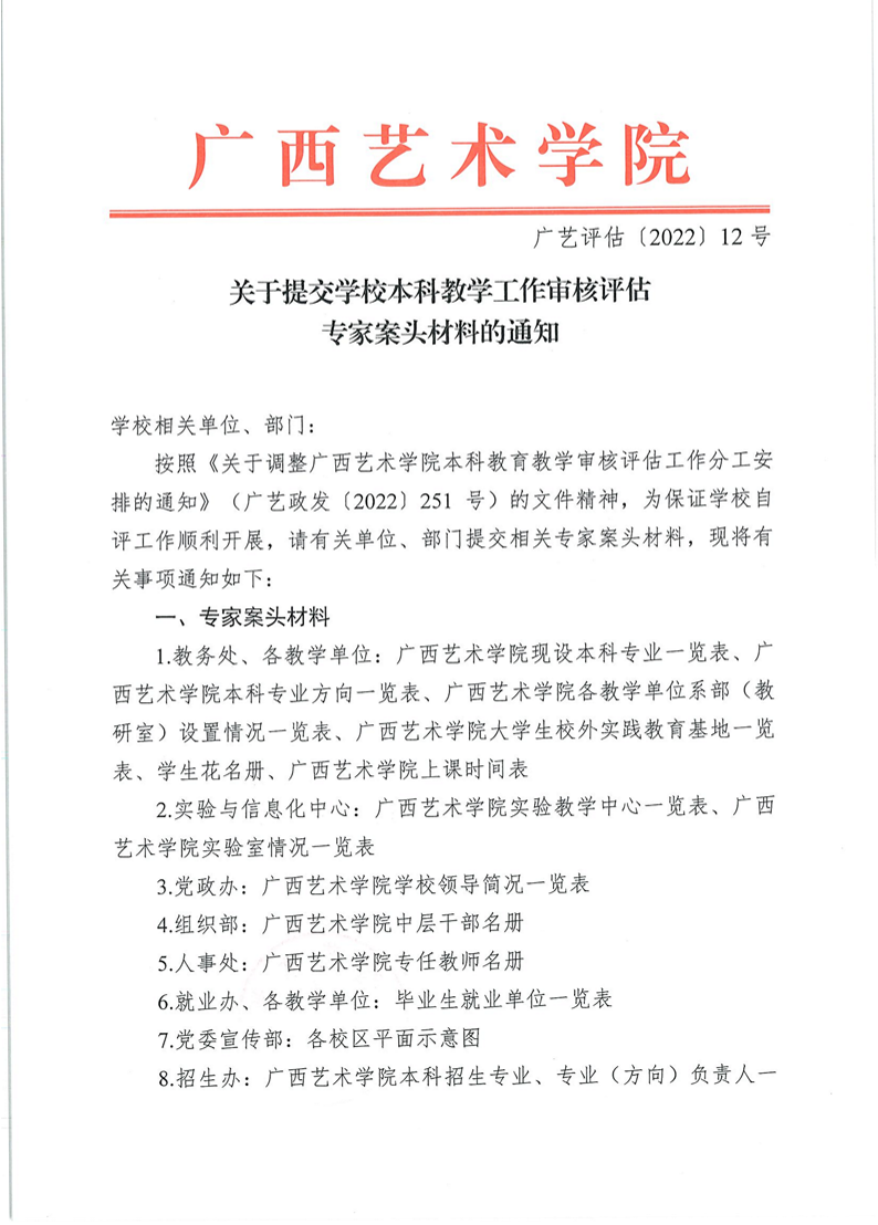 广艺评估〔2022〕12号关于提交学校本科教学工作审核评估专家案头材料的通知