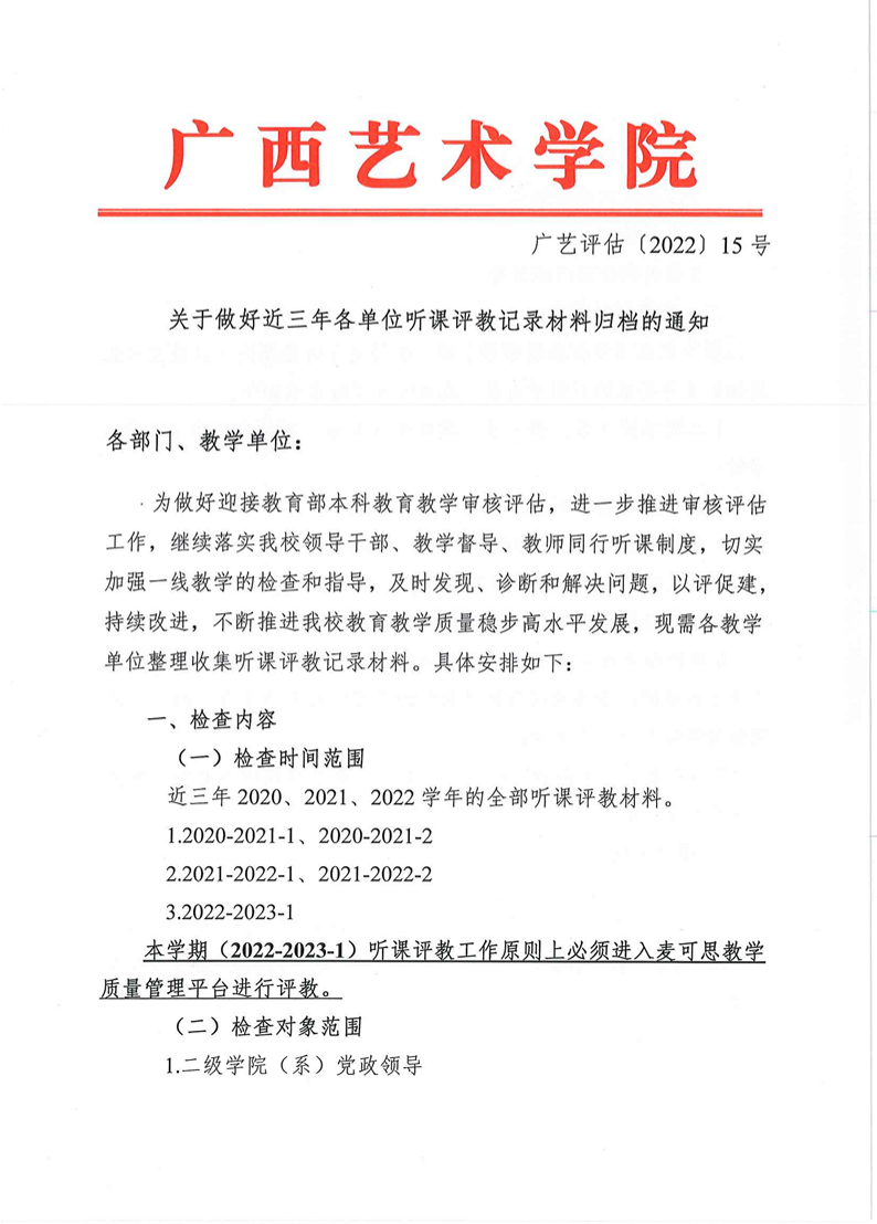 广艺评估〔2022〕15号 关于做好近三年各单位听课评教记录材料归档的通知