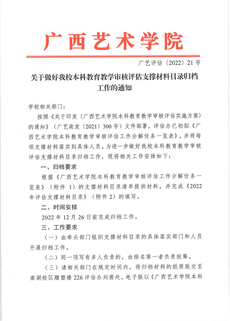 广艺评估〔2022〕21号关于做好我校本科教育教学审核评估支撑材料目录归档工作的通知
