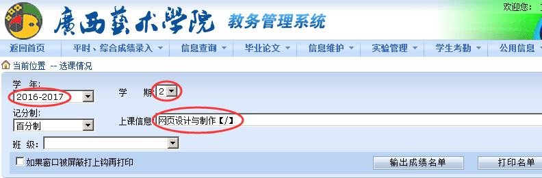 输出以往学年学期成绩步骤 来源: 作者: 时间:2022-02-24 18:00 点击:次 字号:【小 大】 1、教师登录教务系统后,点击“信息查询”菜单下的“选课情况”。 2、切换到相应的“学年”和“学期”,选择相应的班级,点击“输出成绩名单”。 3、选择“格式2”和“格式3”分别各输出一次,格式2为成绩登记表,格式3为试卷分表。 分享到: 打印正文 返回顶部