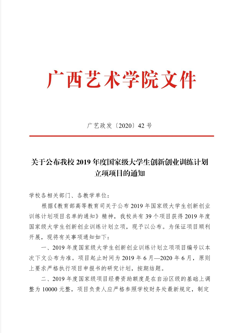 广艺政发2020]42号关于公布我校2019年度国家级大学生创新创业训练计划立项项目的通知 来源: 作者: 时间:2020-03-18 18:25 点击:次 字号:【小 大】 分享到: 打印正文 返回顶部