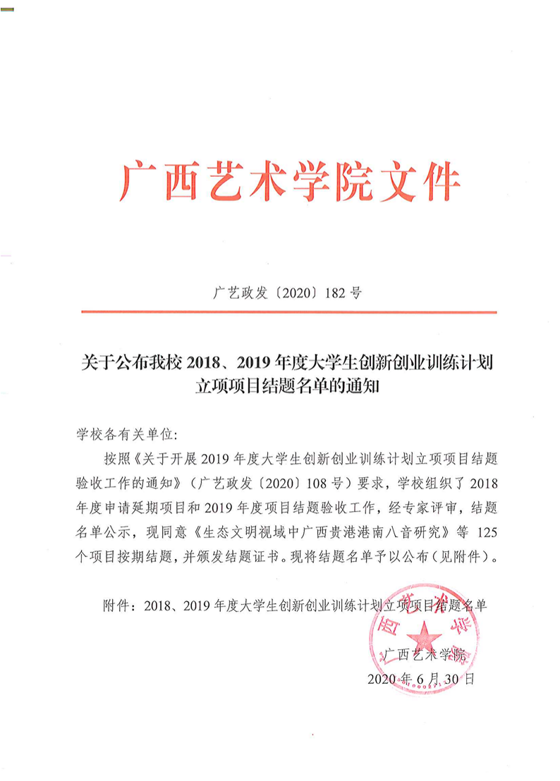 广艺政发[2020]182号 关于公布我校2018、2019年度大学生创新创业训练计划立项项目结题名单的通知 来源: 作者: 时间:2020-06-30 09:50 点击:次 字号:【小 大】 分享到: 打印正文 返回顶部