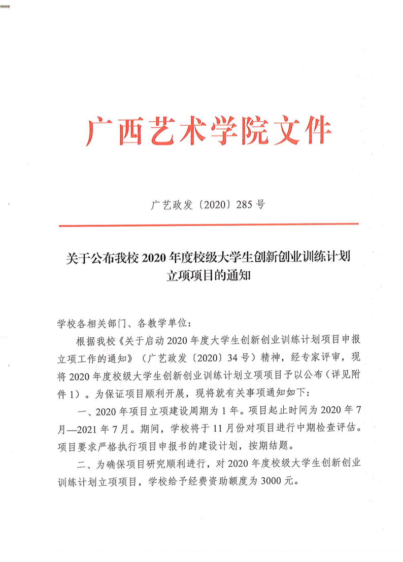 广艺政发〔2020〕285号 关于公布我校2020年度校级大学生创新创业训练计划立项项目的通知 来源: 作者: 时间:2020-09-10 18:30 点击:次 字号:【小 大】 分享到: 打印正文 返回顶部