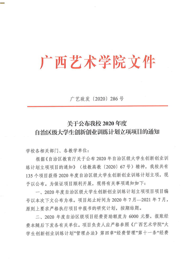 广艺政发〔2020〕286号 关于公布我校2020年度自治区级大学生创新创业训练计划立项项目的通知 来源: 作者: 时间:2020-09-10 22:25 点击:次 字号:【小 大】 分享到: 打印正文 返回顶部