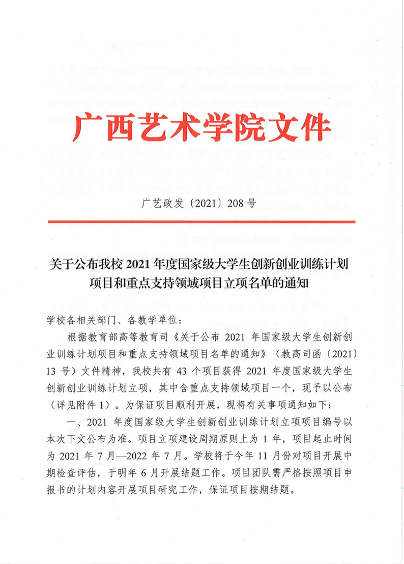 广艺政发〔2021〕208号 关于公布我校2021年度国家级大学生创新创业训练计划项目和重点支持领域项目立项名单的通知 来源: 作者: 时间:2021-09-18 15:34 点击:次 字号:【小 大】 分享到: 打印正文 返回顶部