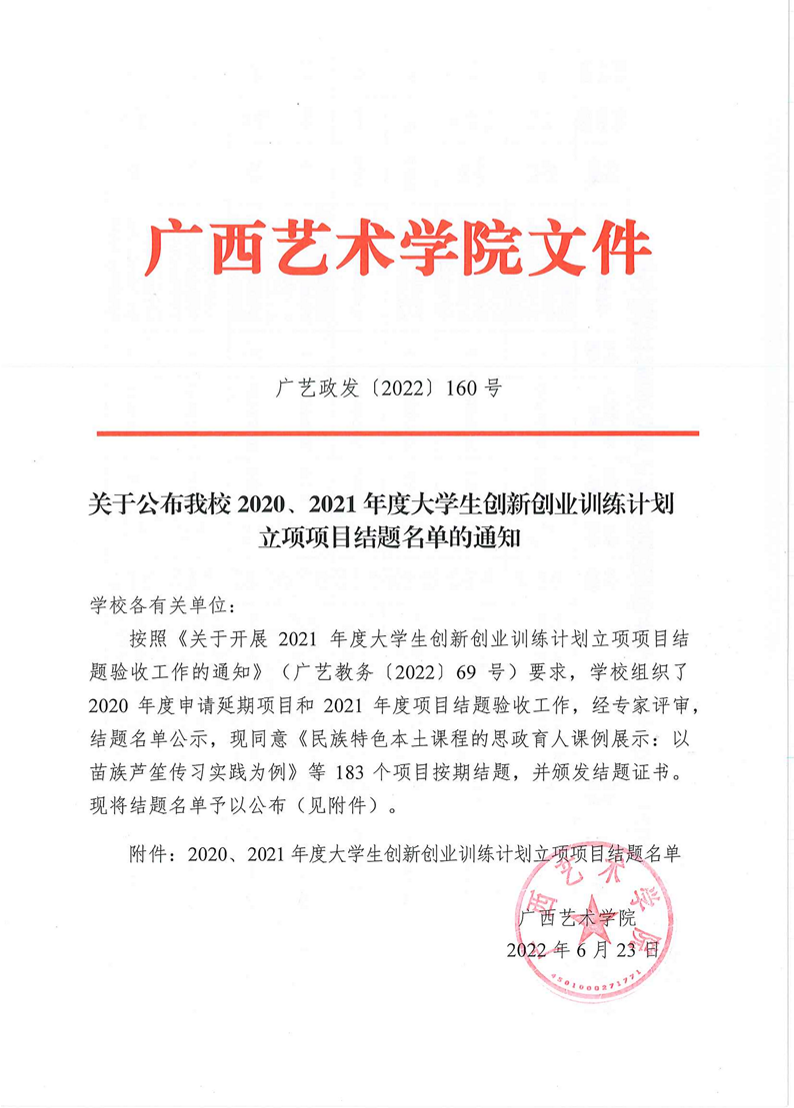 广艺政发〔2022〕160号 关于公布我校2020、2021年度大学生创新创业训练计划立项项目结题名单的通知 来源: 作者: 时间:2022-06-23 10:38 点击:次 字号:【小 大】 分享到: 打印正文 返回顶部