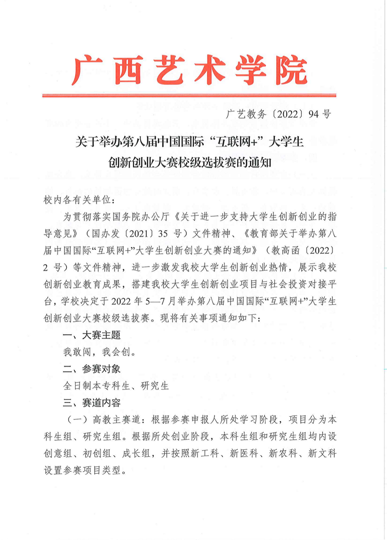 广艺教务〔2022〕 94号 关于举办第八届中国国际“互联网+”大学生创新创业大赛校级选拔赛的通知