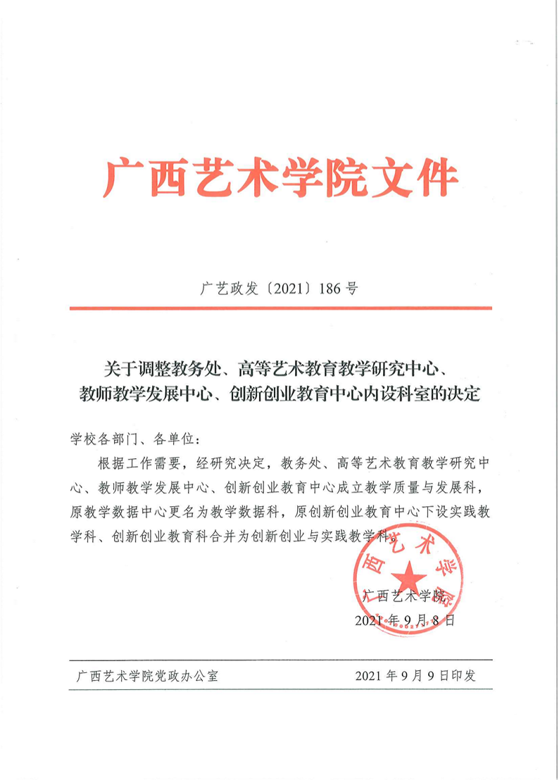 广艺政发〔2021〕186号 关于调整教务处、高等艺术教育教学研究中心、教师教学发展中心、创新创业教育中心内设科室的决定 来源: 作者: 时间:2021-09-09 10:50 点击:次 字号:【小 大】 分享到: 打印正文 返回顶部