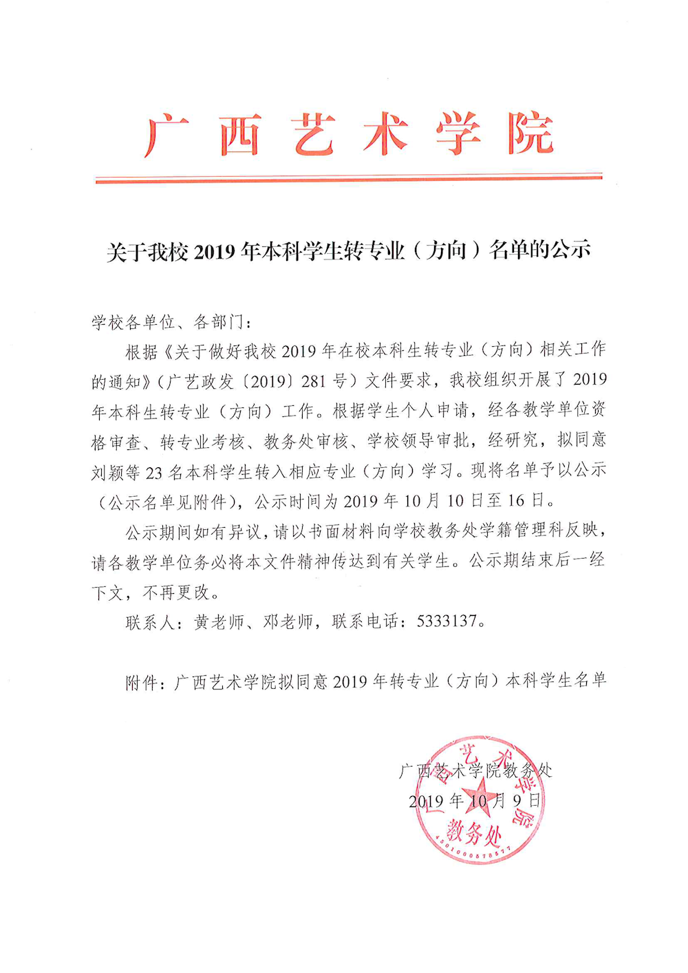 关于我校2019年本科学生转专业(方向)名单的公示 来源: 作者: 时间:2019-10-09 15:34 点击:次 字号:【小 大】 关于我校2019年本科学生转专业(方向)名单的公示(点击下载) 分享到: 打印正文 返回顶部