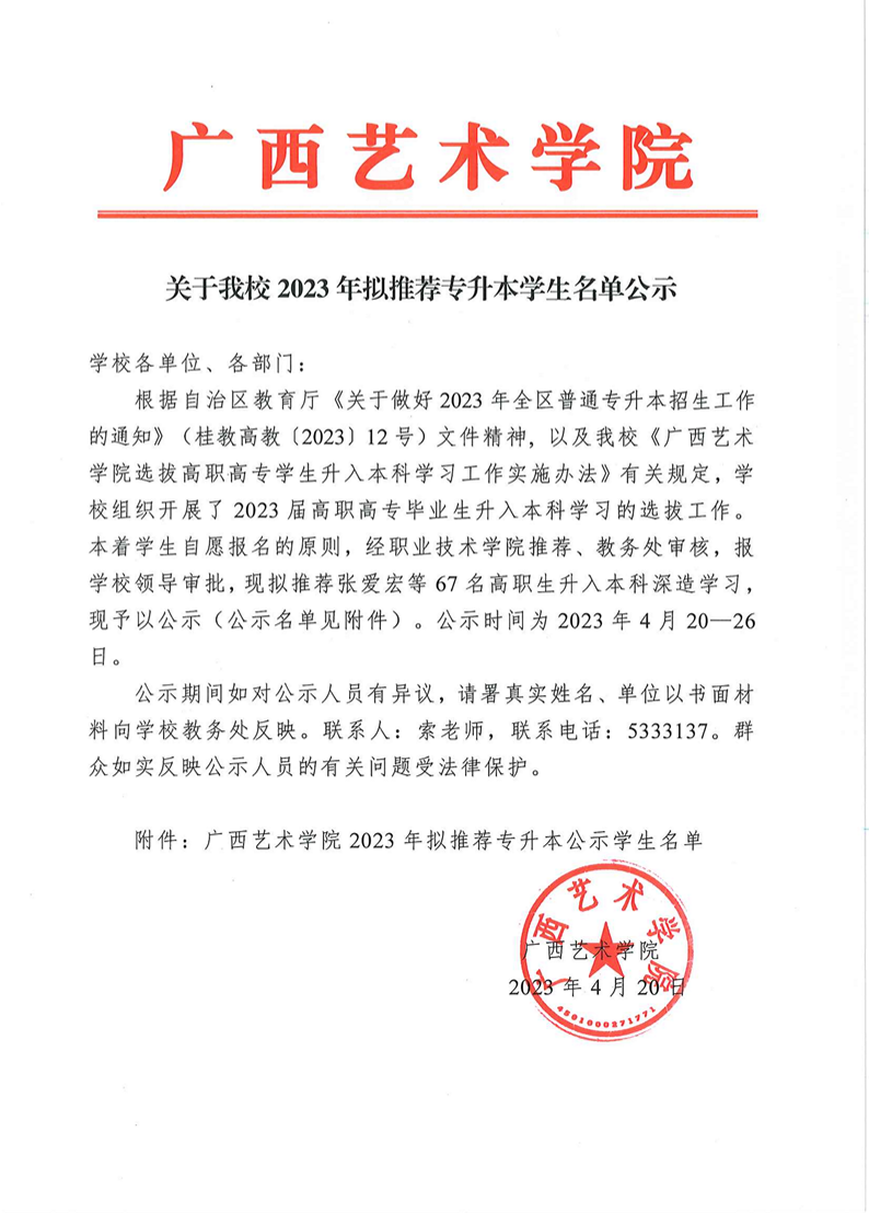 关于我校2023年拟推荐“专升本”学生名单公示