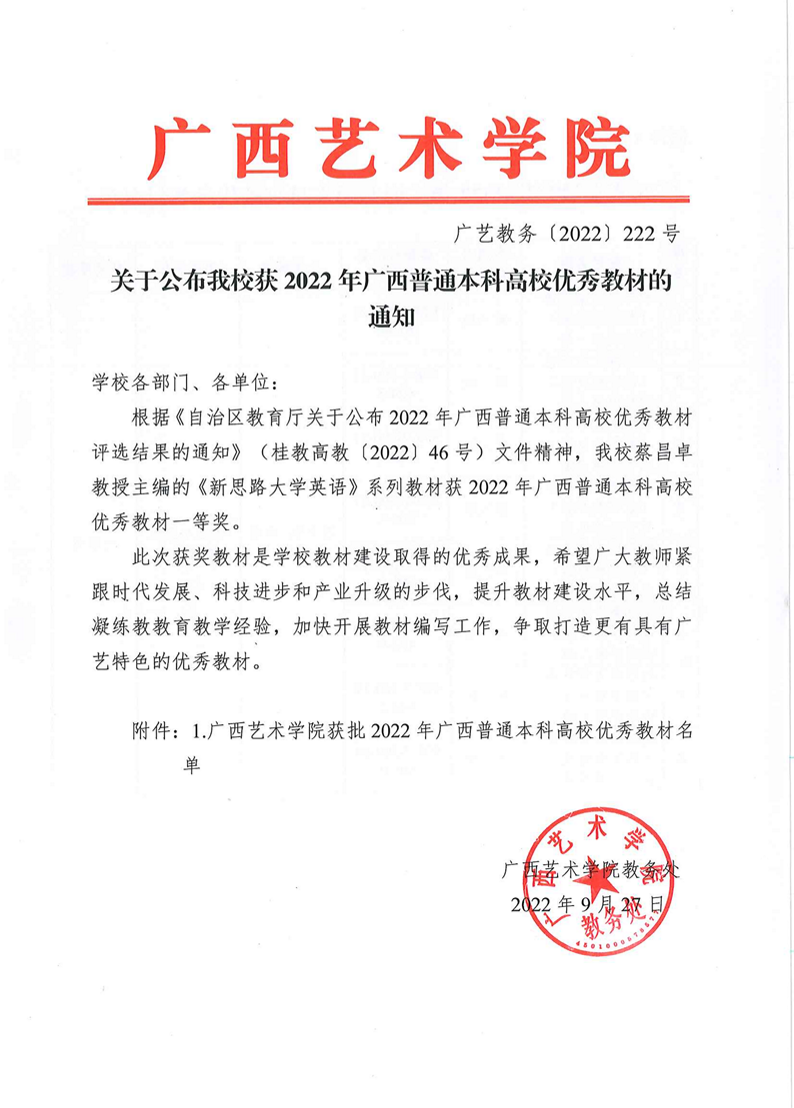 广艺教务〔2022〕222号 关于公布我校获2022年广西普通本科高校优秀教材的通知