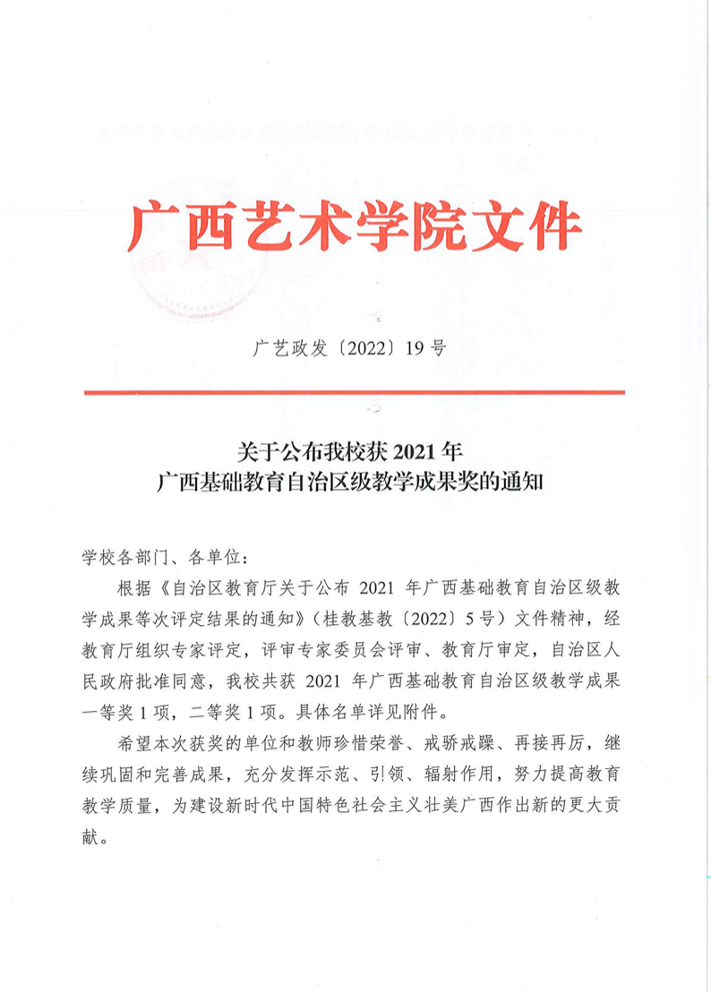 广艺政发〔2022〕19号 关于公布我校获2021年广西基础教育自治区级教学成果奖的通知 来源: 作者: 时间:2022-02-25 15:37 点击:次 字号:【小 大】 分享到: 打印正文 返回顶部