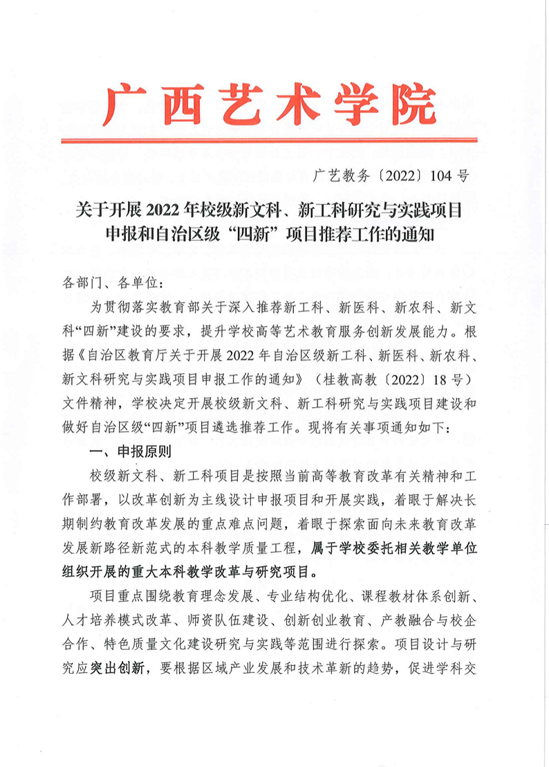 广艺教务〔2022〕104号 关于开展2022年校级新文科、新工科研究与实践项目申报和自治区级“四新”项目推荐工作的通知 来源: 作者: 时间:2022-05-11 17:59 点击:次 字号:【小 大】 分享到: 打印正文 返回顶部