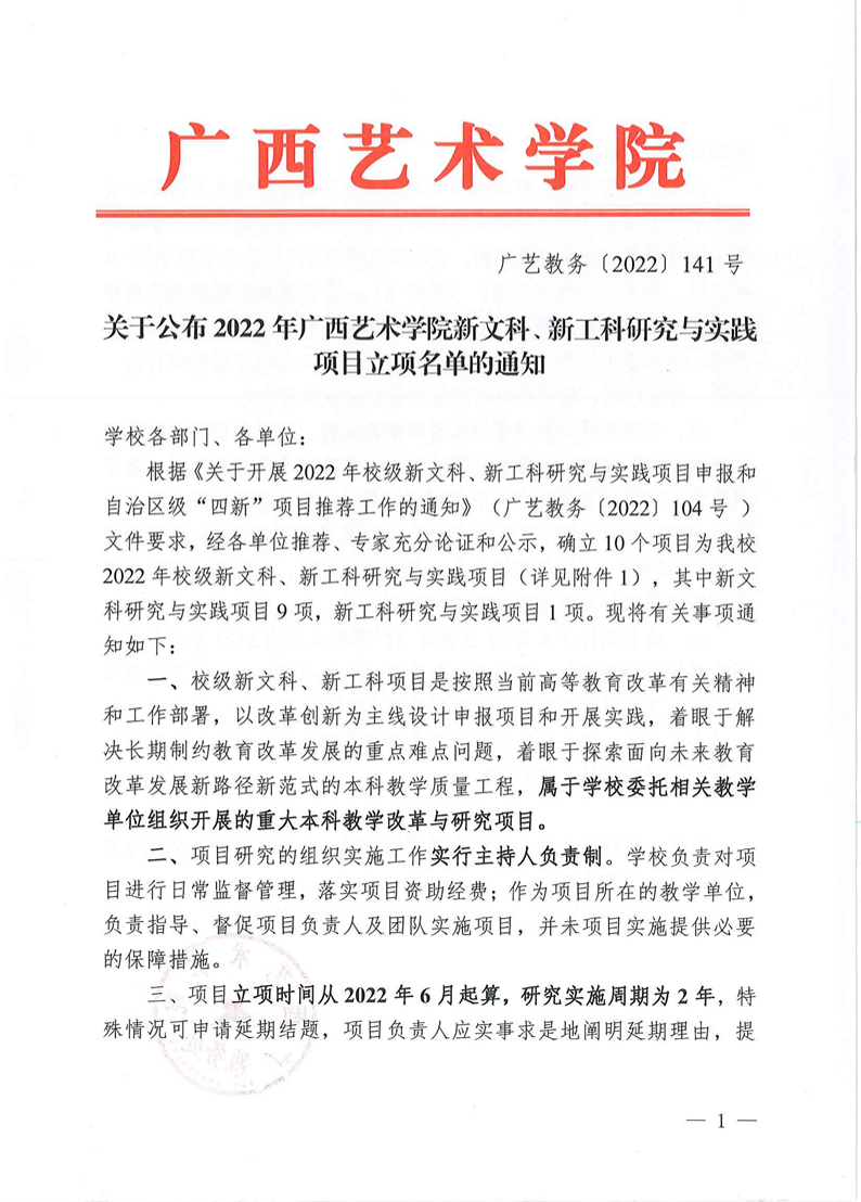广艺教务〔2022〕141号 关于公布2022年校级新文科、新工科研究与实践项目
