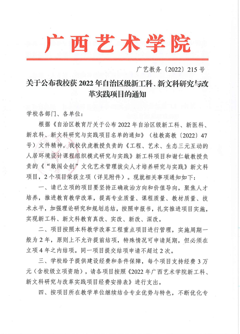 广艺教务〔2022〕215号 关于公布我校获2022年自治区级新工科、新文科研究与改革实践项目的通知 来源: 作者: 时间:2022-09-22 18:06 点击:次 字号:【小 大】 分享到: 打印正文 返回顶部