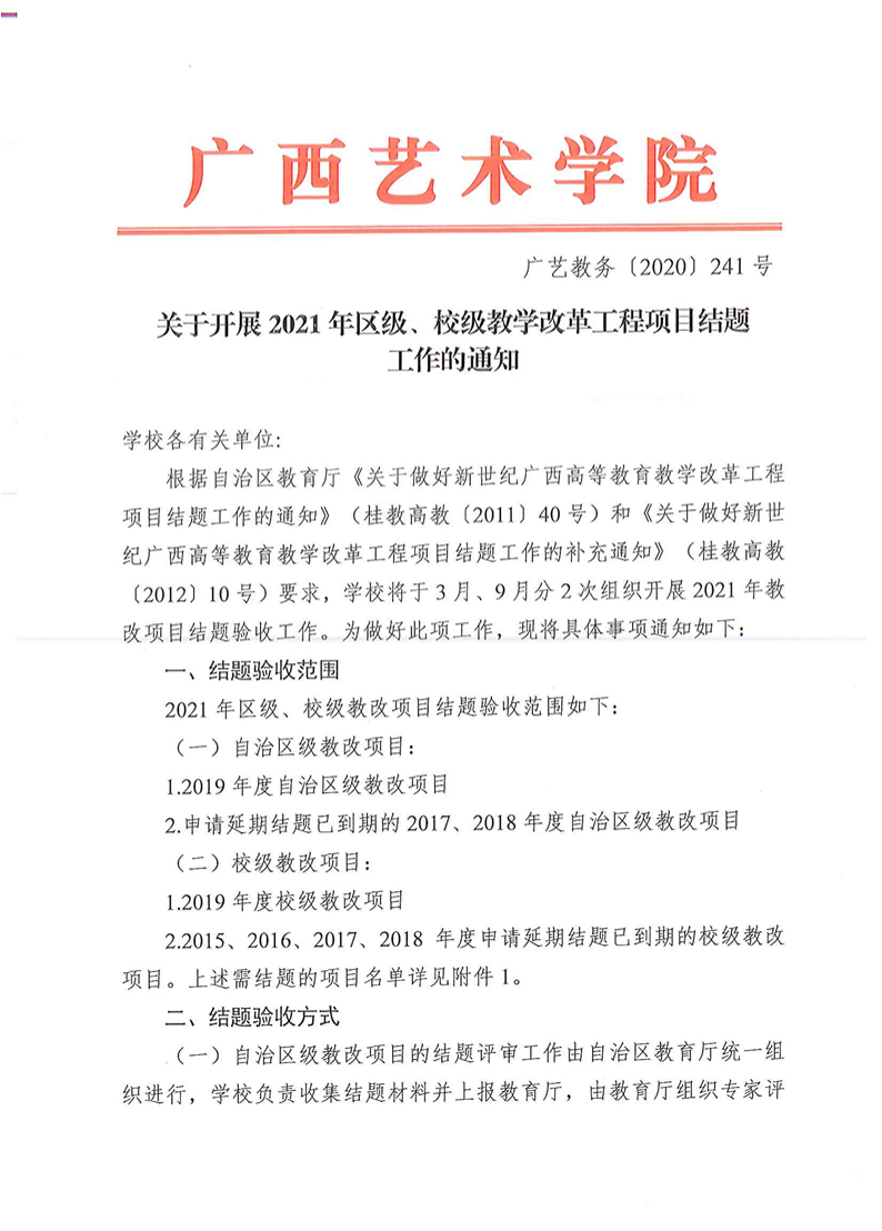 广艺教务〔2020〕241号 关于开展2021年区级、校级教学改革工程项目结题工作的通知 来源: 作者: 时间:2020-12-30 09:58 点击:次 字号:【小 大】 附件9袋内材料目录明细表(参考样式).docx区级教改项目结题附件6—8.zip校级教改项目结题附件2—5.zip 分享到: 打印正文 返回顶部