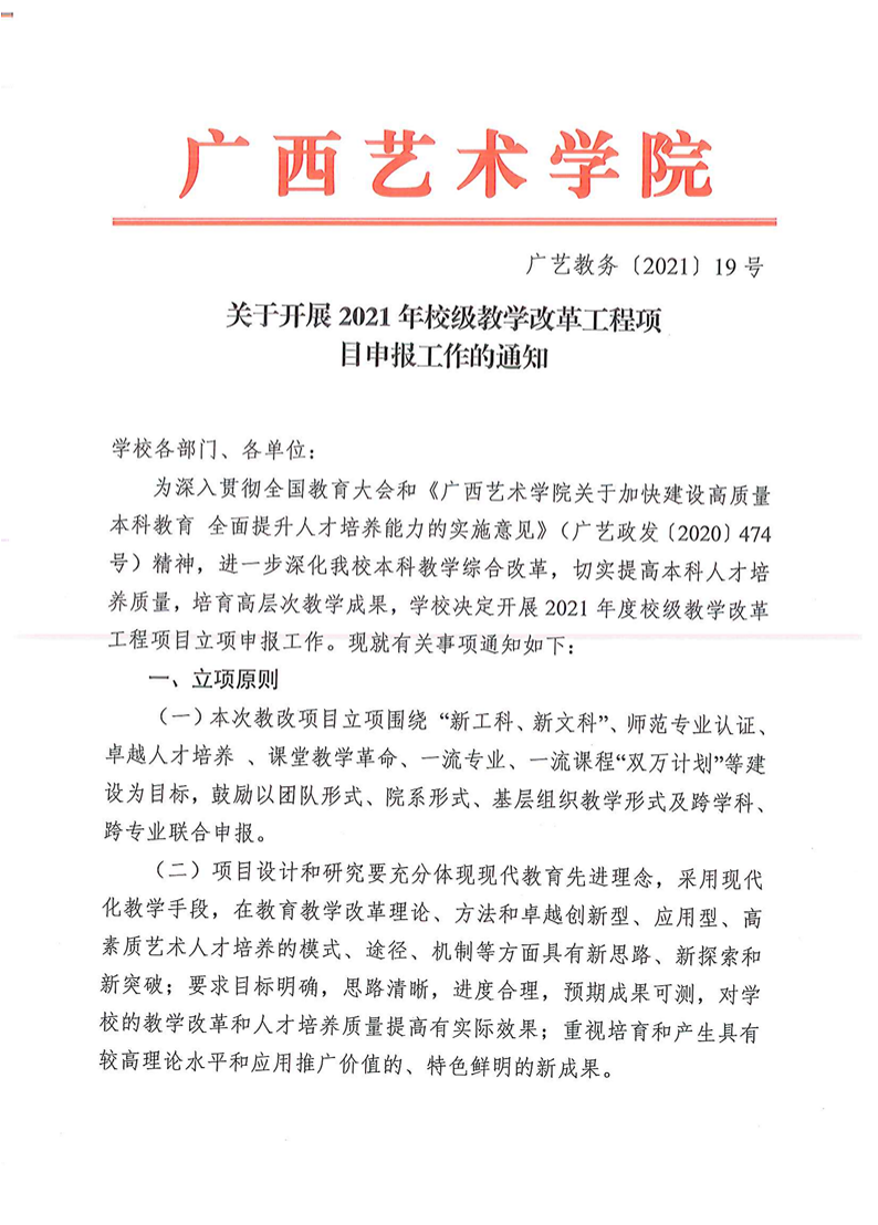 广艺教务〔2021〕19号 关于开展2021年校级教学改革工程项目申报工作的通知 来源: 作者: 时间:2021-01-22 10:04 点击:次 字号:【小 大】 附件22021年度必威西汉姆联高等教育教学改革工程立项项目申请书.doc附件12021年度校级教改项目申报汇总表.doc 分享到: 打印正文 返回顶部