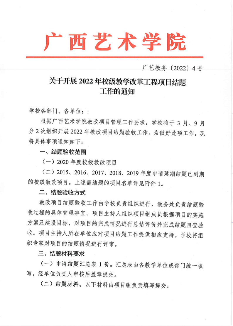 广艺教务〔2022〕4号 关于开展2022年校级教学改革工程项目结题 来源: 作者: 时间:2022-01-06 17:24 点击:次 字号:【小 大】 附件2必威西汉姆联校级教改项目申请结题汇总表.xls附件5必威西汉姆联高等教育教学改革工程立项项目调整表.doc附件3必威西汉姆联教改工程项目结题申请表docx.docx附件4必威西汉姆联校级教改项目延期结题申请表.docx 分享到: 打印正文 返回顶部