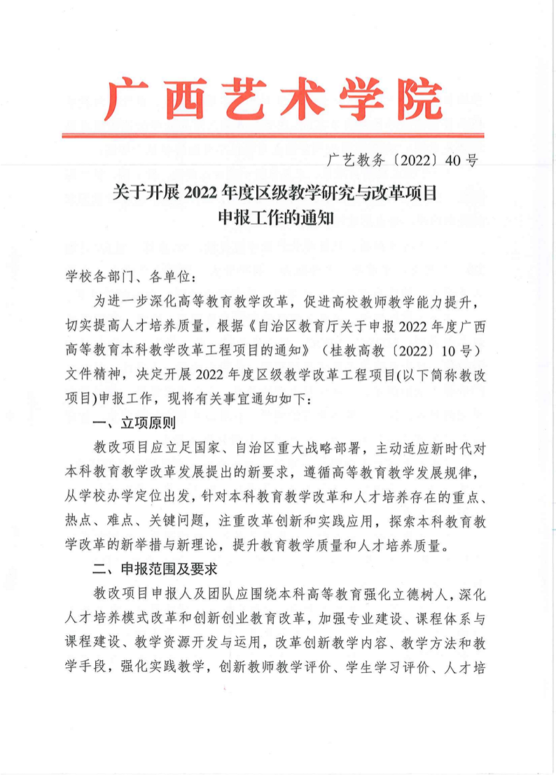 广艺教务〔2022〕40号 关于开展2022年度区级教学研究与改革项目申报工作的通知 来源: 作者: 时间:2022-03-16 10:41 点击:次 字号:【小 大】 附件12022年度广西高等教育本科教学改革工程项目申请书.docx附件4.桂教规范〔2022〕4号自治区教育厅关于印发《广西高等教育本科教学改革工程项目管理办法》的通知.pdf附件3.桂教高教〔2022〕10号自治区教育厅关于申报2022年度广西高等教育本科教学改革工程项目的通知.pdf附件2.2022年度广西高等教育本科教学改革工程项目申报汇总表.xlsx 分享到: 打印正文 返回顶部