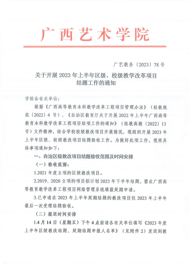广艺教务〔2023〕78号 关于开展2023年上半年区级、校级教学改革项目结题工作的通知 来源: 作者: 时间:2023-04-13 18:54 点击:次 字号:【小 大】 附件2.2023年度上半年区级教改结题、延期结题申报人名单.xls附件4.必威西汉姆联教改工程项目结项申请表.docx附件5.必威西汉姆联校级教改项目申请结题汇总表.xls附件6.教学改革系统变更-结题使用说明文档.docx附件3.广西高等教育本科教学改革工程项目结项申请表(1).docx 分享到: 打印正文 返回顶部