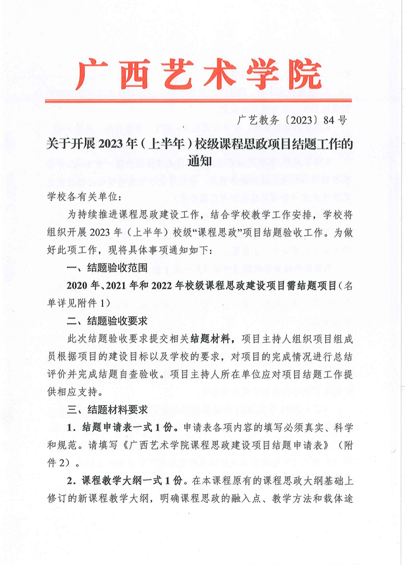 广艺教务〔2023〕84 号 关于开展2023年(上半年)校级课程思政项目结题工作的通知 来源: 作者: 时间:2023-04-18 17:12 点击:次 字号:【小 大】 分享到: 打印正文 返回顶部
