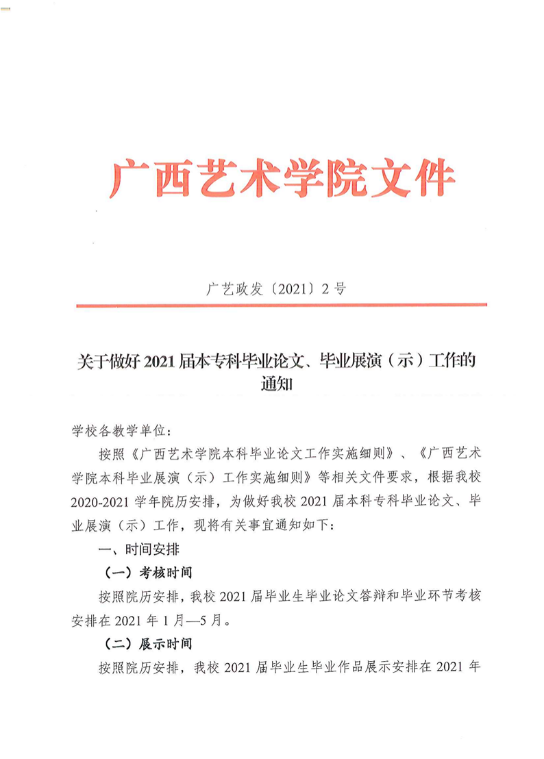 广艺政发[2021]2号关于做好2021届本专科毕业论文、毕业展演(示)工作的通知 (含附件) 来源: 作者: 时间:2021-07-07 11:07 点击:次 字号:【小 大】 分享到: 打印正文 返回顶部