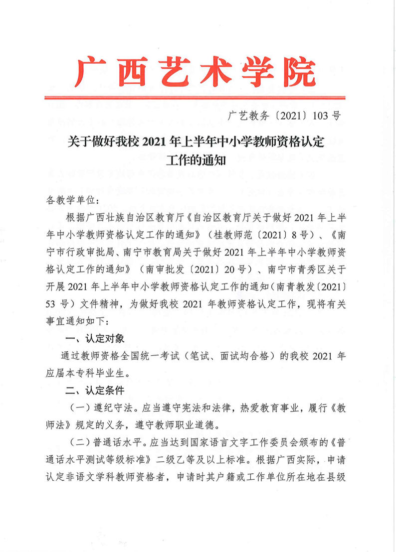 广艺教务[2021]103号关于做好我校2021年中小学教师资格认定工作的通知