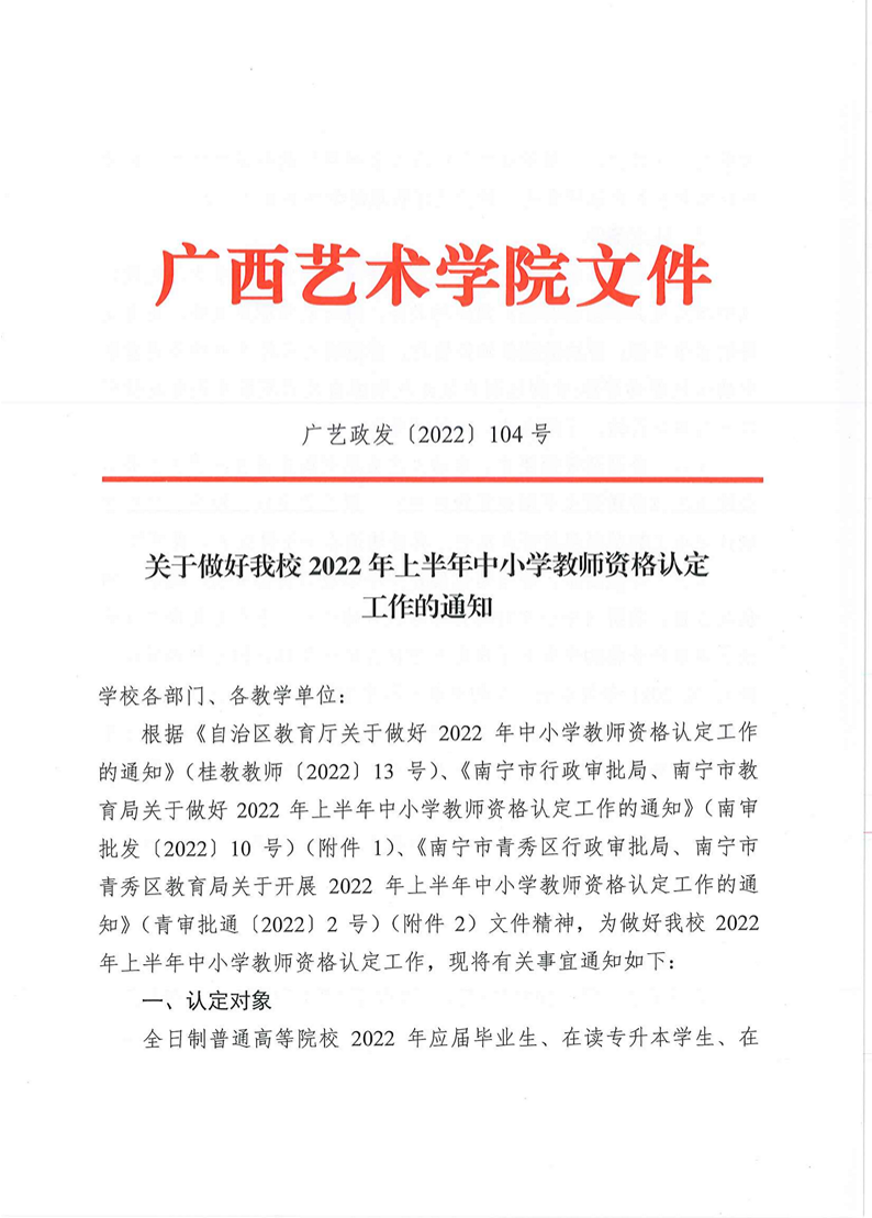广艺政发〔2022〕104号关于做好我校2022年上半年中小学教师资格认定工作的通知