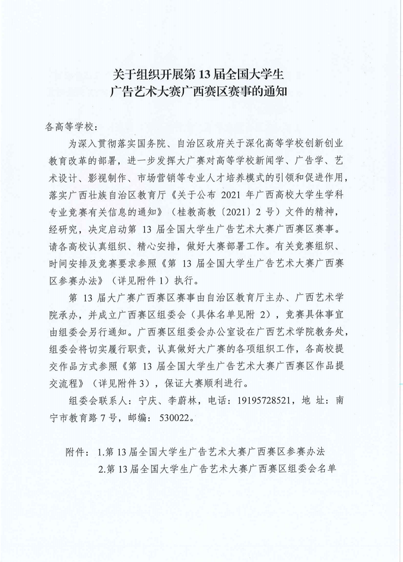 关于组织开展第13届全国大学生广告艺术大赛广西赛区赛事的通知 来源: 作者: 时间:2021-06-21 15:40 点击:次 字号:【小 大】 附件4.第13届全国大学生广告艺术大赛广西赛区XXX院校联系人信息表.xlsx附件5.第13届全国大学生广告艺术大赛广西赛区参赛作品汇总表.xls 分享到: 打印正文 返回顶部