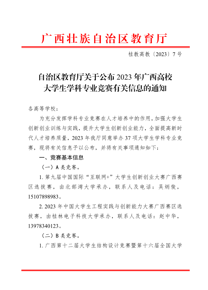 桂教高教〔2023〕7号自治区教育厅关于公布2023年广西高校大学生学科专业竞赛有关信息的通知 来源: 作者: 时间:2023-02-27 08:58 点击:次 字号:【小 大】 桂教高教〔2023〕7号自治区教育厅关于公布2023年广西高校大学生学科专业竞赛有关信息的通知.pdf 分享到: 打印正文 返回顶部
